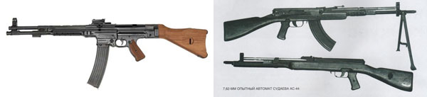 AK-47ÀÇ µîÀåÀº Á¦2Â÷ ¼¼°è´ëÀüÀÇ µ¶¼ÒÀüÀïÀ¸·Î °Å½½·¯ ¿Ã¶ó°£´Ù. 1942³â ¸» ¼Ò·Ã±ºÀº µ¶ÀϱºÀÇ ÃÖ½ÅÇü µ¹°Ý¼ÒÃÑÀÎ Mkb42¸¦ óÀ½À¸·Î ´ëÇÏ°Ô µÇ¾ú´Ù. ¼Ò·Ã±ºÀº ¿¬¹ß±â´ÉÀ» À¯ÁöÇϸ鼵µ µû¹ßÃѺ¸´Ù »ç°Å¸®°¡ ±ä ¡®µ¹°Ý¼ÒÃÑ¡¯À̶õ Á¾·ù¿¡ ´«µ¶À» µé¿´´Ù. µ¶ÀÏÀÇ Mkb42 µ¹°Ý¼ÒÃѰú ¹Ì±ºÀÌ °ø±ÞÇÑ M1 Ä«ºó ¼ÒÃÑÀ» ³õ°í °í¹ÎÇÏ¸é¼ ¾î¶² °ÍÀ» ¹ÙÅÁÀ¸·Î ±¹»ê¼ÒÃÑÀ» ¸¸µéÁö °í¹ÎÇϰí ÀÖ¾ú´Ù. 1945³â ¼ö´Ù¿¹ÇÁ°¡ °³¹ßÇÑ AS-44 ¼ÒÃÑÀÌ ½ÃÇèÀûÀ¸·Î ä¿ëµÇ±âµµ ÇßÁö¸¸, 5kg°¡ ³Ñ´Â ¹«°Ô ¶§¹®¿¡ °á±¹ Àü±º¿¡ º¸±ÞµÇÁö´Â ¸øÇÏ¿´´Ù.